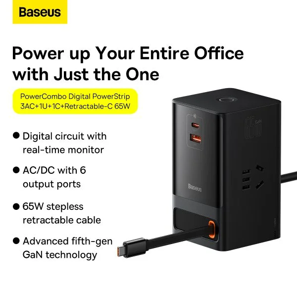Baseus PowerCombo Digital PowerStrip 3AC+1U+1C+Retractable-C 65W with 1.5m power cord CN Black PSLR000001