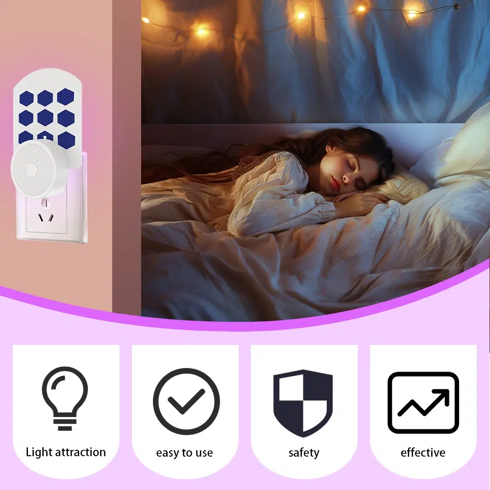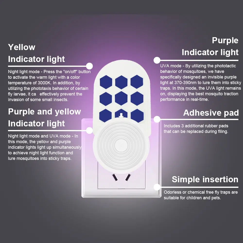 Three modes:-Yellow light: repel mosquitoes and insects, and use the night light-Purple light: attracts mosquitoes and insects-Yellow and purple lights: attract mosquitoes and insects, and light up at night