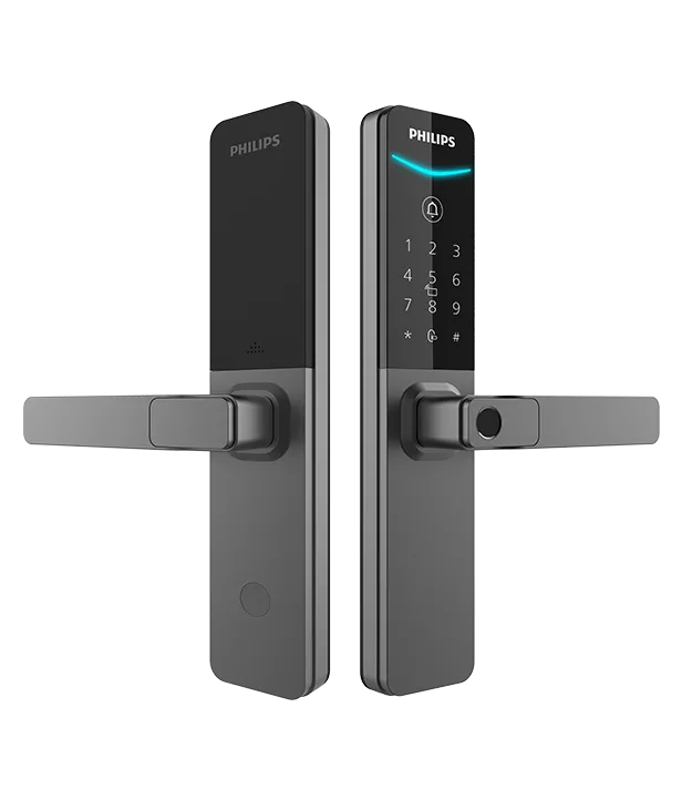 DDL615-5HBS combines compactness and security with a minimalist 56mm*-wide panel for various doors. Easy setup via the Home Access App. The one-grip fingerprint sensor allows quick unlock, while remote PIN management keeps access secure.